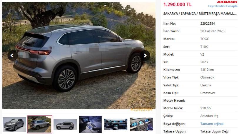 TOGG araçlar Nisan ayı itibariyle ilk sahiplerine teslim edilmeye başlandı. Sapanca'dan da öğretmen olduğu öğrenilen bir kişi TOGG marka T10X V2 uzun menzil aracını 1 milyon 290 bin lira bedelle satışa çıkardı. Otomobil satış sitelerinde haberin hazırlandığı tarihte ise sadece 4 adet TOGG aracın satış ilanı bulunuyordu.