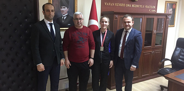 Uluslararası Turkish Open Karate Turnuvası'nda 2. Olan Beyzanur Keleş, Antrenörü Tayfun Kobaş'la birlikte Sapanca Kaymakam vekili Hüseyin Kaptan'ı ziyaret etti.