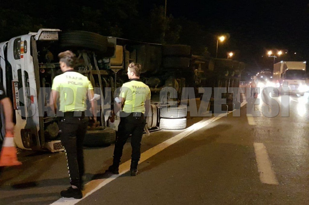 Sapanca ilçesinde tırın devrilmesi sonucu meydana gelen trafik kazasında 1 kişi yaralandı. Kaza sonucu kabininde sıkışan yardımcı sürücü Eyüp Karahanlı itfaiye ekiplerinin çalışması ile kurtarıldı.