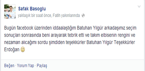 Başoğlu, yine facebook hesabı üzerinden yazdığı "Bugün facebook üzerinden iddalaştığım Batuhan Yılgür arkadaşımız seçim sonuçları sonrasında beni arayarak tebrik etti ve takım elbisenin rengini ve ne zaman alacağımı sordu. Şimdiden teşekkürler Batuhan Yılgür. Teşekkürler Erdoğan." mesajı ile teşekkür etti.