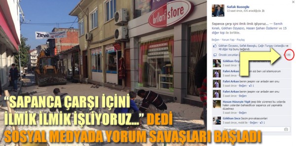 Sapanca Belediye Özel Kalem Müdürü Şafak Başoğlu Facebook’a “Sapanca çarşı içini ilmik ilmik işliyoruz...” dedi. Sosyal medyada yorum savaşları başladı. O paylaşıma gelen yorum sayısı şu saatlerde 131'i buldu.