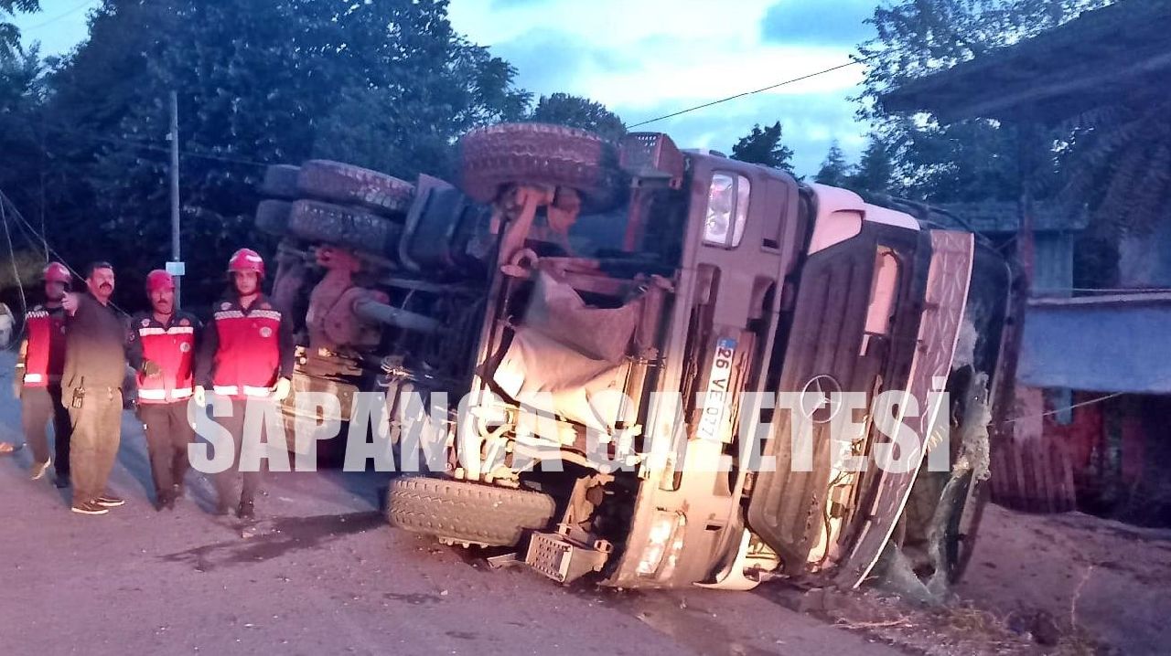 Sapanca ilçesinde freni boşalan hafriyat kamyonu elektrik direğine çarparak devrildi.