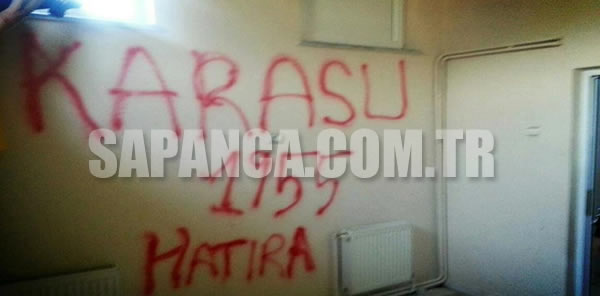 Yazı, Karasusporlu futbolcuların Sapanca Atatürk stadını terk etmesi sonrası ortaya çıktı. Yazının fotoğraflarını çeken saha görevlisi ve emniyet güçleri Karasuspor Kulübü hakkında yasal işlem yapılacağını açıkladı.