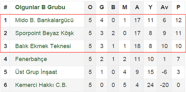 Olgunlar Kategorisi B Grubunda, grup karşılaşmaları dün gece oynanan Mido Botanik Bankargücü, Balık Ekmek Teknesi karşılaşması ile sona erdi. Buna göre Mido Botanik Bankargücü birinci, Sporpoint Beyaz Köşk ikinci ve Balık Ekmek Teknesi üçüncü olarak çeyrek finalde mücadele etme hakkı kazandı.