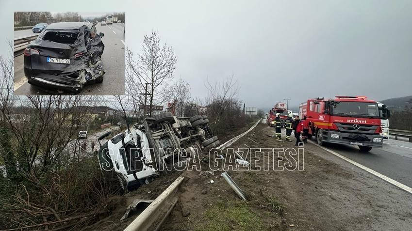 Çarpmanın etkisiyle otomobil savrulurken, kamyon ise demir bariyerleri aşarak şarampole devrildi. Kazada Otomobil sürücüsü A.F.Y. ile aynı araçta yolcu olarak bulunan B. A. Y., (31) ile kamyon sürücüsü yaralandı. İhbar üzerine olay yerine sağlık, itfaiye ve otoyol jandarma ekipleri sevk edildi. Yaralılar, sağlık ekiplerince Sapanca İlçe Devlet Hastanesine kaldırıldı. Kazayla ilgili inceleme başlatıldı.