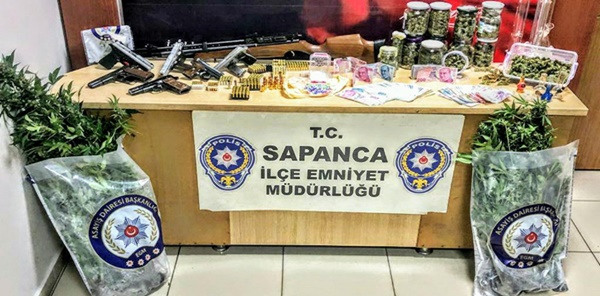 Sapanca ilçesinde, polis ekiplerince bir eve düzenlenen operasyon sonucunda çok sayıda ruhsatsız tabanca ve uyuşturucu madde ele geçirildi.