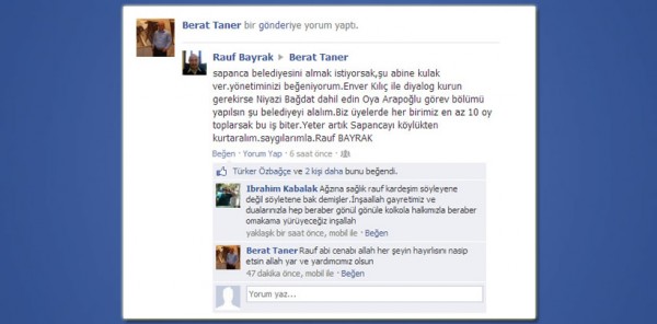 "Sapanca Belediyesini almak istiyorsak şu ağabeyine kulak ver. Yönetiminizi beğeniyorum. Enver Kılıç ile diyalog kurun gerekirse Niyazi Bağdat dahil edin Oya Arapoğlu görev bölümü yapılsın şu belediyeyi alalım. Biz üyelerde her birimiz en az 10 oy toplarsak bu iş biter. Yeter artık Sapanca'yı köylükten kurtaralım. Saygılarımla Rauf Bayrak"
