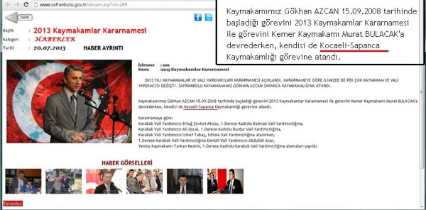 Safranbolu Kaymakamlığı'nın sitesinde yayımlanan yazıda "2013 YILI KAYMAKAMLAR VE VALİ YARDIMCILARI KARARNAMESİ AÇIKLANDI. KARARNAMEYE GÖRE İLİMİZDE DE PEK ÇOK KAYMAKAM VE VALİ YARDIMCISI DEĞİŞTİ. SAFRANBOLU KAYMAKAMIMIZ GÖKHAN AZCAN SAPANCA KAYMAKAMLIĞINA ATANDI.