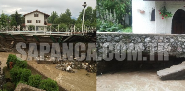 Sapanca ilçesinde etkili olan sağanak yağış dere kenarına yapılan istinat duvarlarını yıktı.