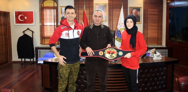 K1 Profesyonel Kick Boks Turnuvasında Türkiye Şampiyonu olan Elif Beyza Yıldırım, Sapanca Belediye Başkanı Aydın Yılmazer'i ziyaret etti.