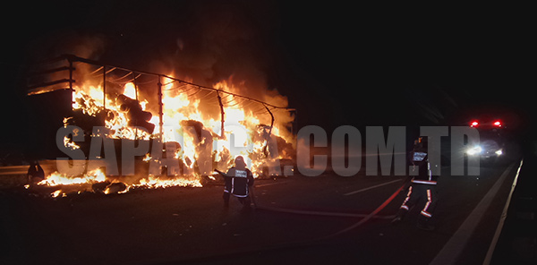 Sapanca ilçesinde seyir halindeki tırın dorsesi yandı.