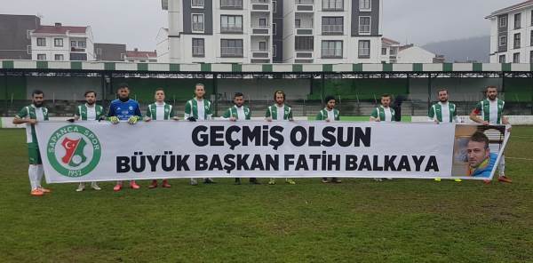 Sapancaspor sahaya geçtiğimiz günlerde geçirdiği rahatsızlık sonucu hastanede tedavi gören Sapanca Gençlikspor'un eski Başkanı Fatih Balkaya'ya ithafen "Geçmiş olsun büyük başkan" yazılı pankartla çıktı.