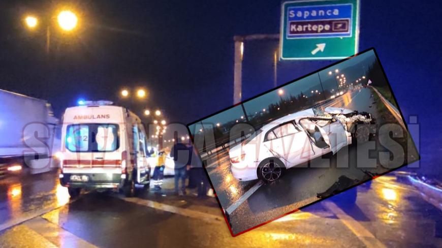 Alınan bilgiye göre; Anadolu Otoyolu'nda Ankara yönüne giden Uğur Keskin (50) idaresindeki 34 CPV 460 plakalı otomobil, sürücüsünün direksiyon hakimiyetini kaybetmesi sonucu Sapanca yol ayrımında Faruk Gökçe (51) idaresindeki 27 AGL 169 plakalı tırla çarpıştı.