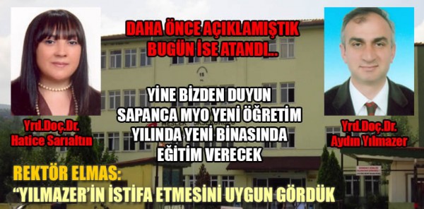 Sapanca.com.tr olarak daha önce Sapanca Meslek Yüksek Okul Müdürü Aydın Yılmazer’in istifa ettiğini duyurmuştuk. İstifa etmediği yönünde de çok tepki almıştık. Rektör Elmas bu gece Aydın Yılmazer'in istifa ettiğini açıkladı.