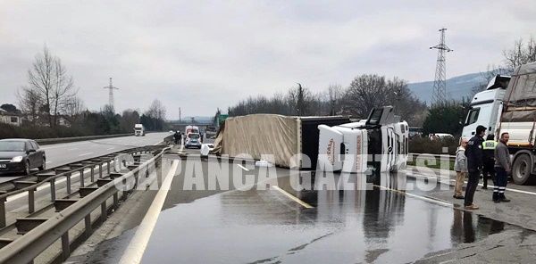 Alınan bilgiye göre; İstanbul istikametine giden Abdullah Çelikbaş idaresindeki 63 FF 985 plakalı beyaz eşya yüklü tır, tem otoyolu Sapanca geçişinde sürücüsünün direksiyon hakimiyetini kaybetmesi sonucu karşı şeride geçti ve yan yattı.