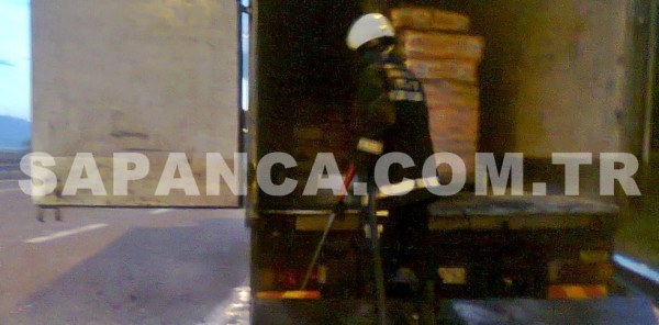 Edinilen bilgiye göre, İstanbul istikametinden Ankara istikametine giden Rıdvan D. İdaresindeki 06 EU 0793 plakalı Firigofik kasalı kamyon seyir halinde iken alev aldı. Diğer araç sürücülerinin uyarısı ile aracını emniyet şeridine çeken sürücü İtfaiye yi arayarak yardım istedi. Kısa sürede olay yerine gelen Sakarya Büyükşehir Belediyesine bağlı Sapanca İtfaiye Gurubu Ekibi yanmakta olan araca müdahale ederek yangını söndürdü. Araç içerisinde bulunan 2 bin kilo toz şeker ve yaklaşık 100 koli deterjan kullanılamaz hale gelirken, yangının kasa içersinde bulunan elektrik kablolarından çıktığı öğrenildi.