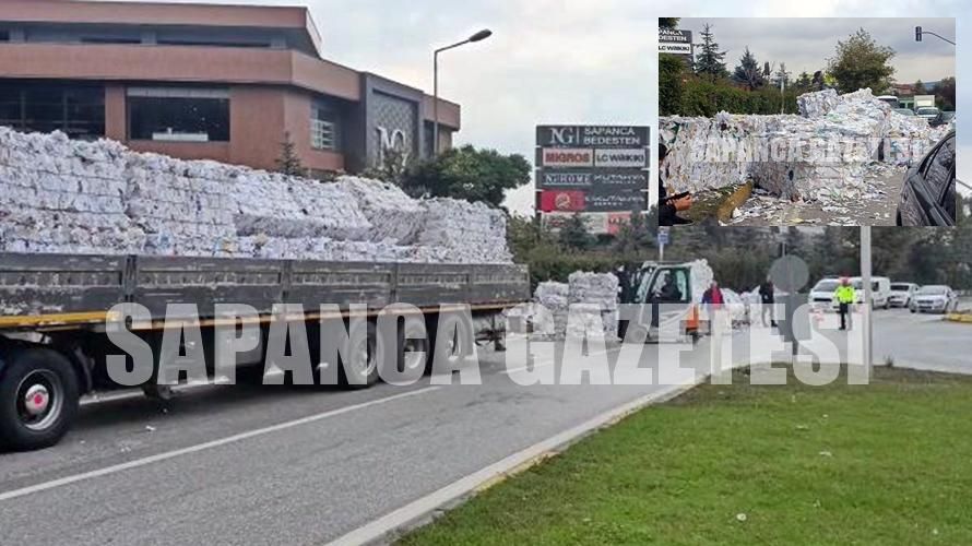 TIR'DAN DÜŞEN KAĞIT BALYALARI YOLA SAÇILDI: Sapanca ilçesinde geri dönüşüm malzemesi yüklü tırda yüklü kağıtlar yola döküldü.