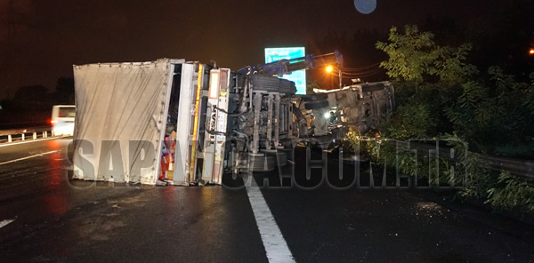 Sakarya'nın Sapanca ilçesinde yiyecek maddesi yüklü tırın devrilmesi konucu, TEM ulaşıma kapandı.