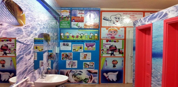 "Okulumuzdaki tuvalet kapılarını, duvar ve pencereleri çizgi film kahramanları, görsel yazı ve çeşitli eğitici şekillerle kapladık. Çocuklarda el yıkama, diş fırçalama, su tasarrufu, temiz tuvalet alışkanlığı, peçete ve havlu kağıt kullandırma alışkanlığını kazandırmayı hedeflediklerini belirten Adıyaman, projemiz' de bizlere destek olan hayırseverlerimize ve bu projemizde giydirmeleri yapan reklam şirketi yönetici ve çalışanlarına teşekkür ederim''