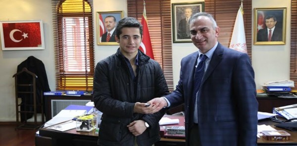 Genç Erkekler Ferdi Boks Şampiyonası'nda Türkiye Şampiyonu olan Ersel Koçman'ı Yılmazer ödüllendirdi.