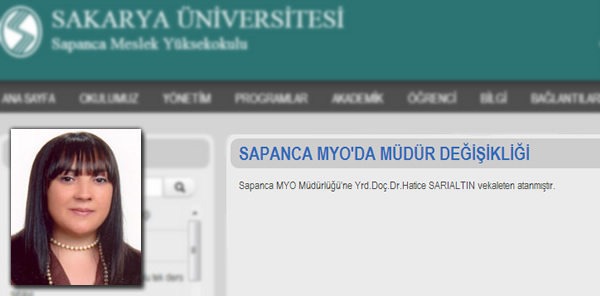 Yrd.Doç.Dr.Hatice Sarıaltın’ın Sapanca MYO Müdürlüğü'ne atanması Sakarya Üniversitesi’nin resmi internet sitesinde yayınlandı.